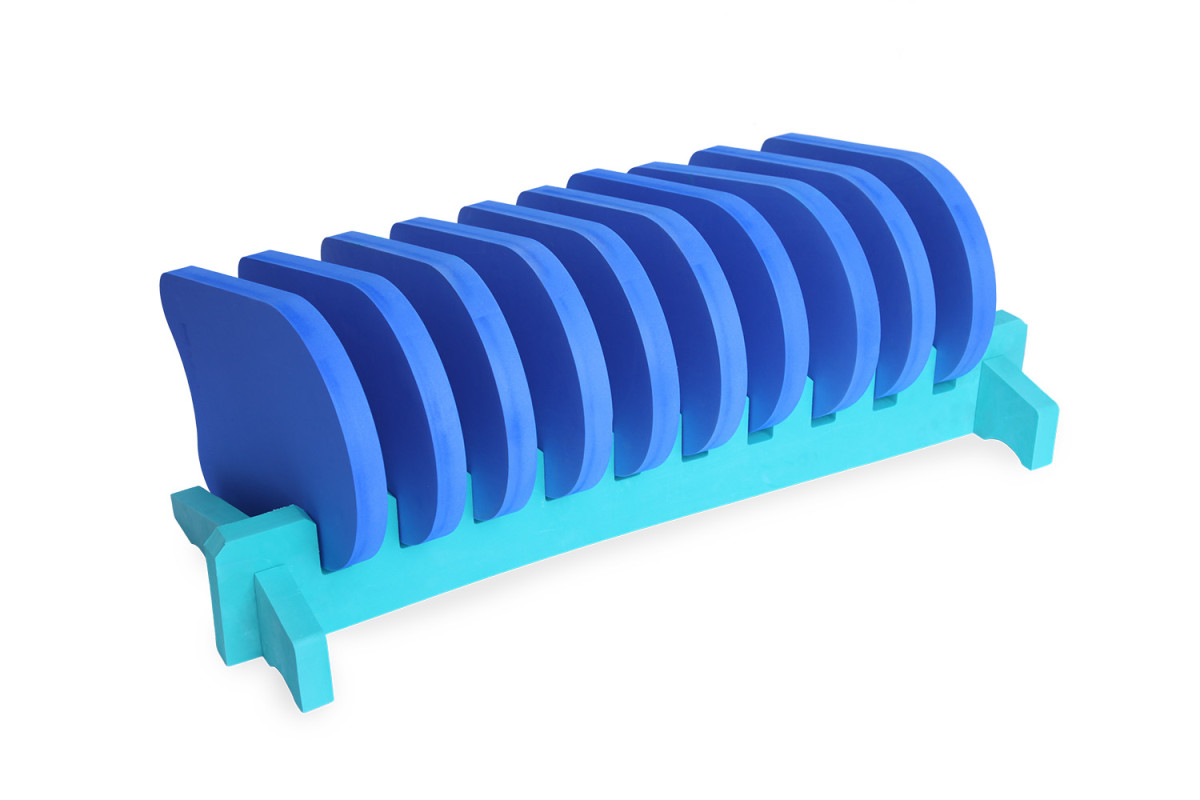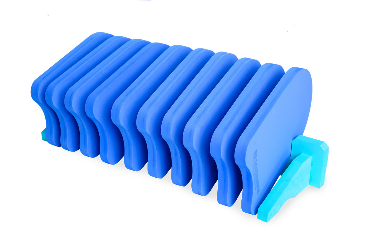 A compact and smart rack made of PVC foam with space for 10 kickboards.