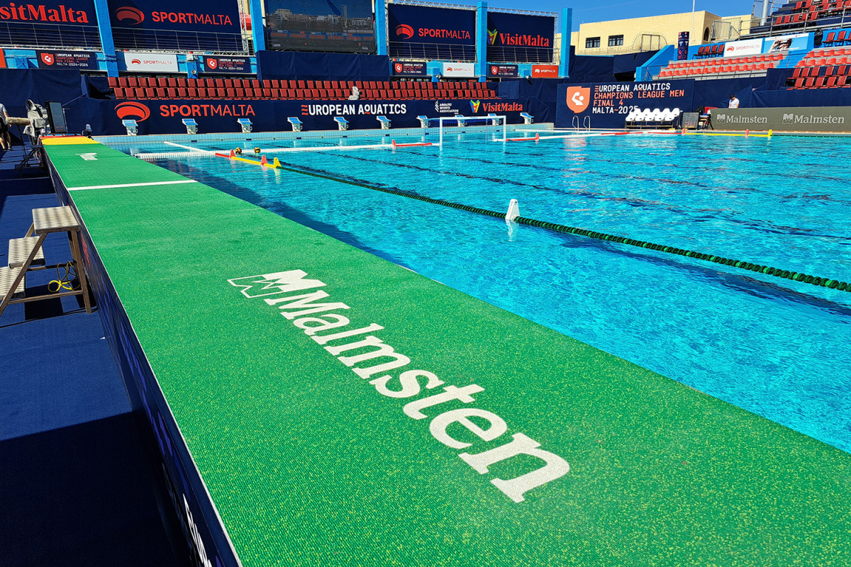 For major championships, one catwalk is required along each side of the field of play (sold per unit). The catwalk has the color markings of the field of play. The color-coded matting is an easy roll-out carpet according to World Aquatics. The catwalk can be delivered in Lockable Storage boxes on wheels (sold separately). Art. no. 1514038