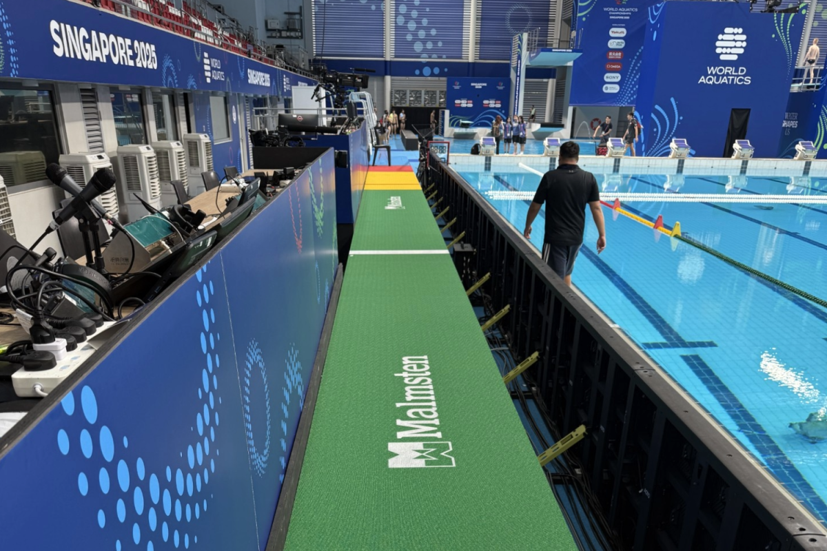 WORLD AQUATICS competition regulations requires the water polo referees´ catwalk to be 700 mm above the water surface, this matting is not in accordance unless placed on an elevated structure. However, an excellent substitute when there is no room on pool deck to place an elevated referees´ catwalk.