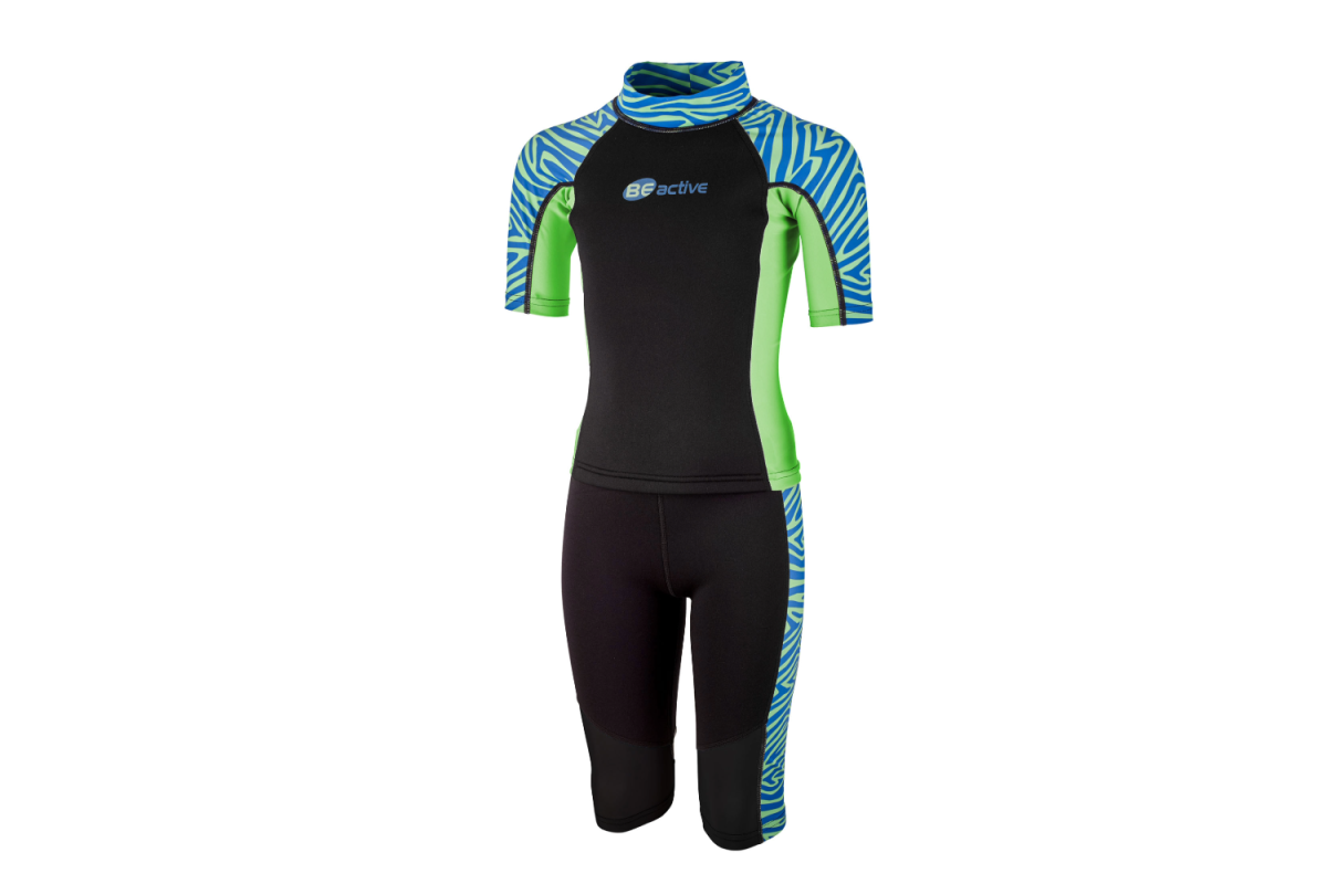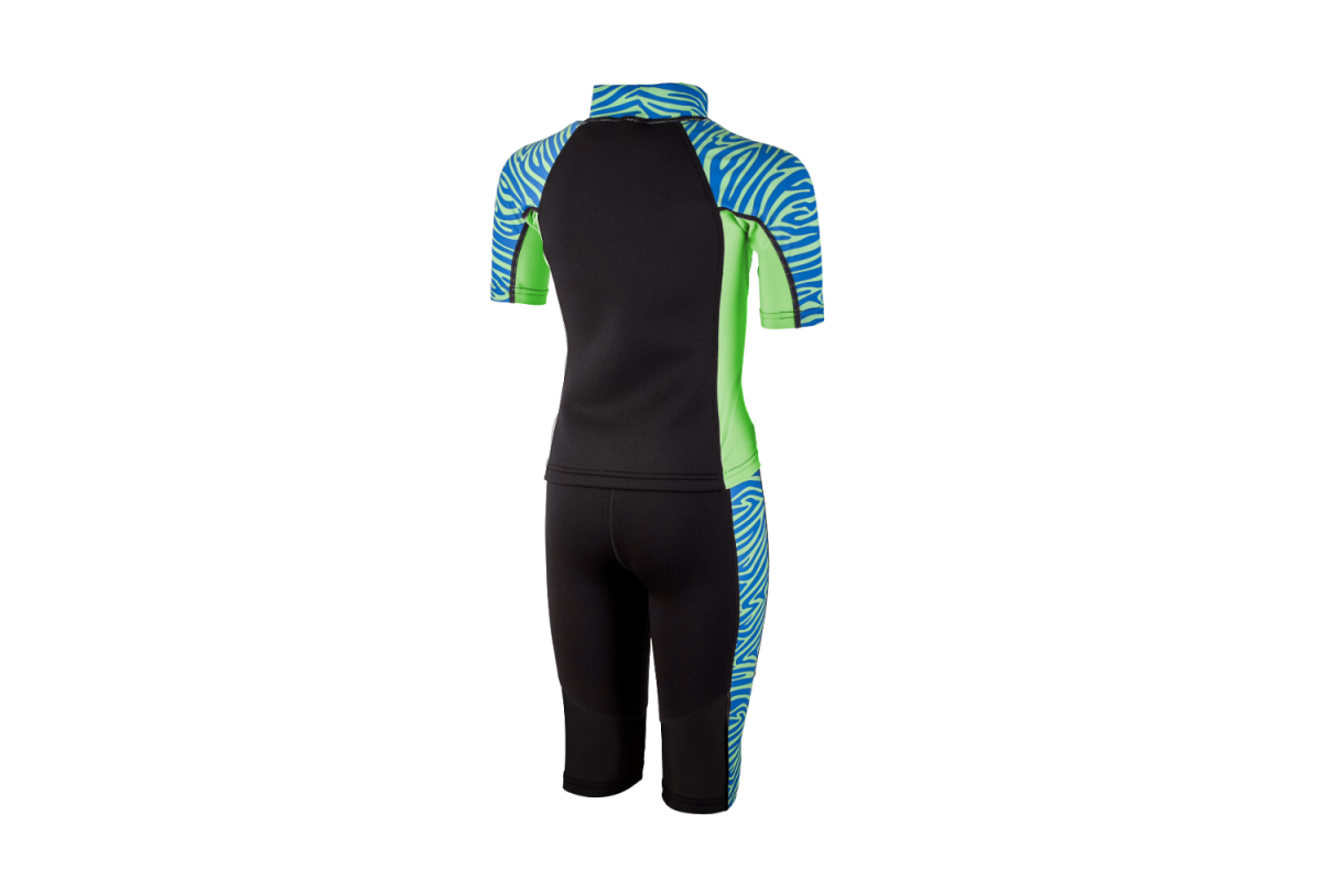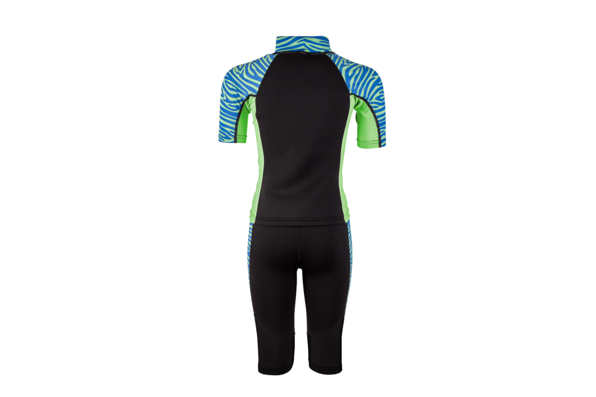 Våtdräkt Zebra för barn i blått och grönt med zebramönster i Shorty- modell, Zebra är tvådelad och består av en kortärmad T-shirt och jammer-shorts som slutar strax ovanför knäet. Zebra är flexibel för optimal rörelsefrihet.